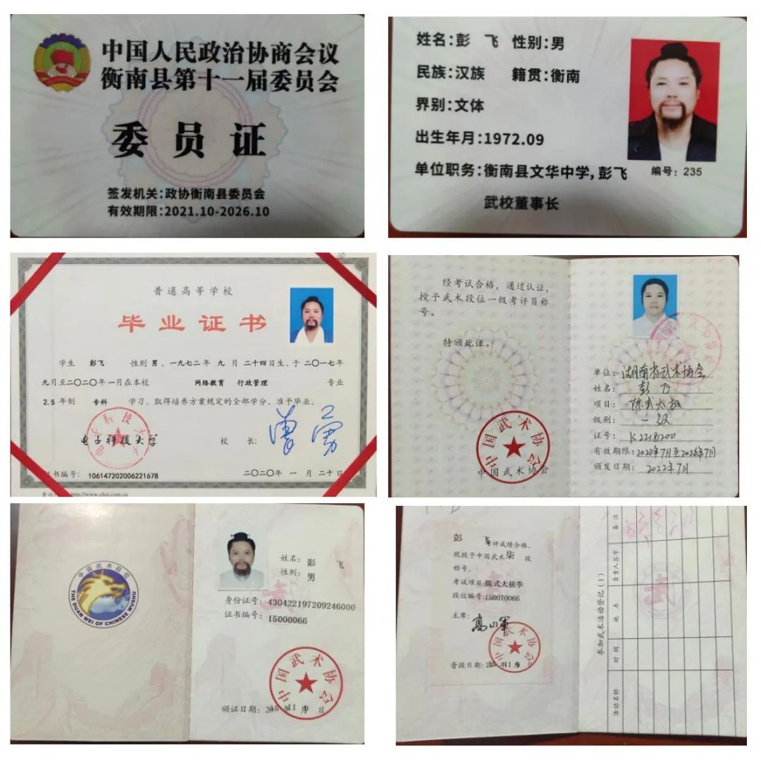 现为中国武术八段,国家级武术、散打裁判员,国家级武术指导员、考评员,湖南省武术协会副主席,衡南县政协常委,永州市道教协会副会长,武当功夫副总教头,衡阳市八中教育集团誉彰中学、衡南县一中教育集团文华中学、衡阳市湘蓝中等职业学校、衡南县彭飞文化武术学校董事长。由于其武功高超、办学思路明确,学校办的有名气,堪称湘南地区有名的武术家、教育家、民营企业家。