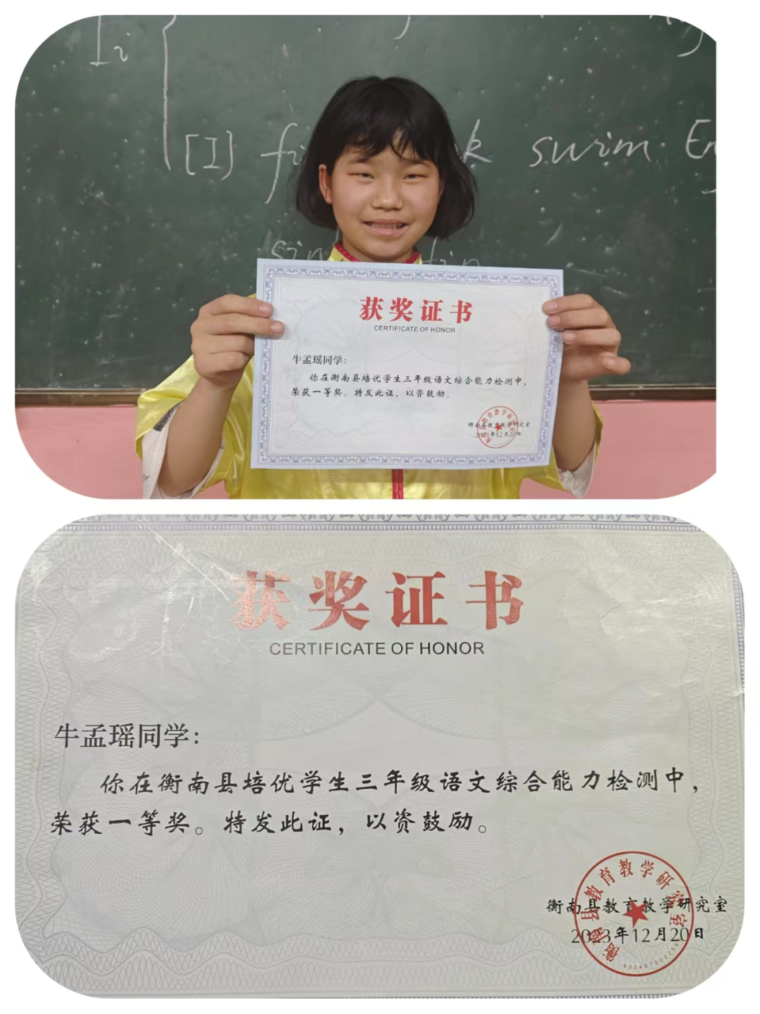 此外,大会还表彰了2023年下半年在衡南县培优学生综合能力测试中表现优异的十位同学。其中,三年级牛梦瑶、阳先成两位同学分别在语文综合能力检测中荣获一等奖和二等奖,他们的出色表现不仅为自己赢得了荣誉,也为学校争得了光彩。这些优秀学子们的成绩,是学校教学质量和学生综合素质的生动体现。